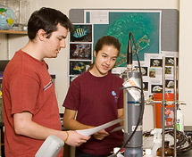 Travis Zerba (left), a member of PEI's information technology staff and a computer science major at Moravian College, consults with Megan Prier, a Princeton student, about the website they are developing for her research. Students in the research project will share their results through media projects linked to an interactive website. It will feature real-time data from a water monitoring probe deployed within the deepest part of Lake Carnegie.