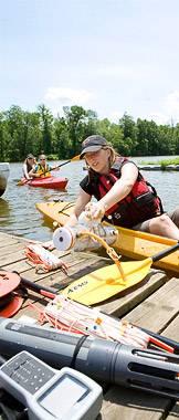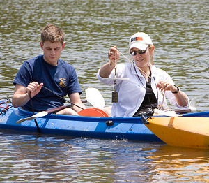 The students in the summer research program divide their time between two work areas -- their bright, airy laboratory in Guyot Hall and their other "laboratory," Lake Carnegie, located a 10-minute walk down Washington Road. Their kayaks, one of them equipped with sonar used to map the depth of the lake, are stored near the water. But they carry their oars and monitoring equipment.
