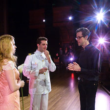 While the original work is set during the Trojan War, stage director Andrew Eggert has set his production during World War I. Here, from right, Eggert works with Fox and Rodda on the final scene of the opera.