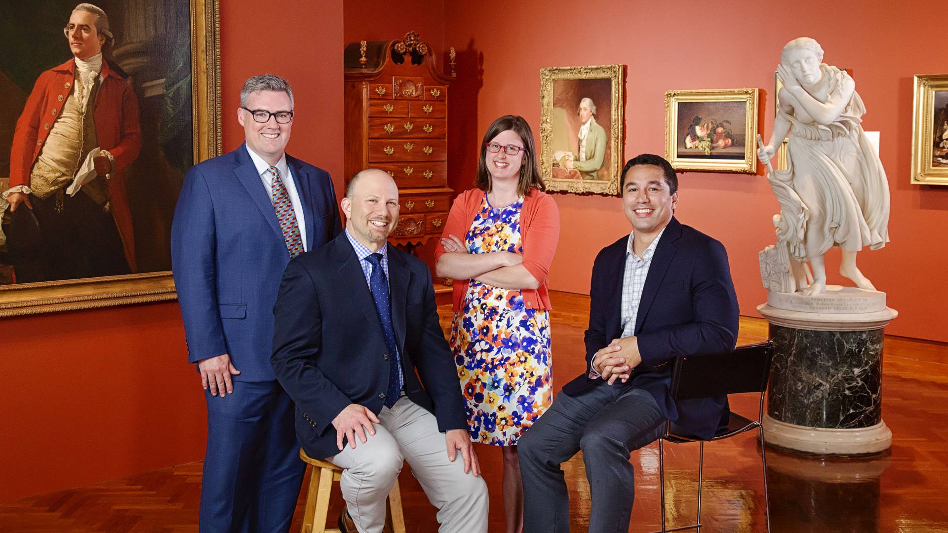 Princeton Writes Essay Contest honorees take a moment to celebrate at the Princeton University Art Museum. From left: Tom Dunne, deputy dean of undergraduate students; Jon Horowitz, associate director for digital communications, Office of Alumni Affairs; Gwen McNamara, communications coordinator, Pace Center for Civic Engagement; and Matt Eaton, information technology manager, Office of Admission.