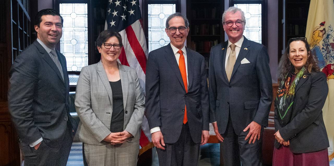 In December 2023, University and state officials announced plans for a new AI hub for New Jersey. Appearing at the event were (from left): New Jersey Economic Development Authority CEO Tim Sullivan; Princeton University Provost Jennifer Rexford; Princeton University President Christopher L. Eisgruber; New Jersey Gov. Phil Murphy; and Beth Noveck, New Jersey State Chief Artificial Intelligence Strategist.